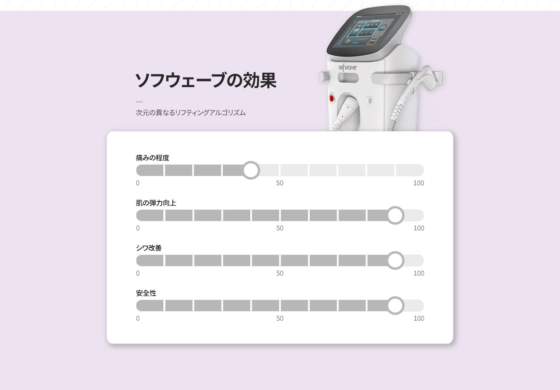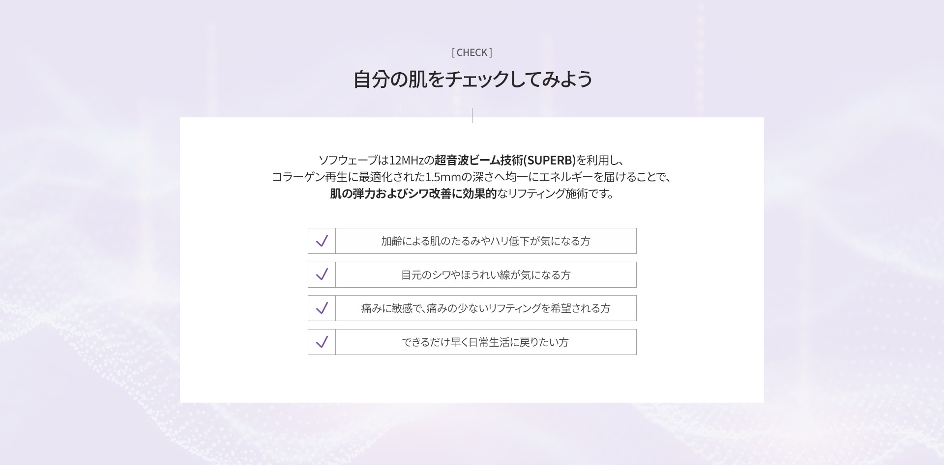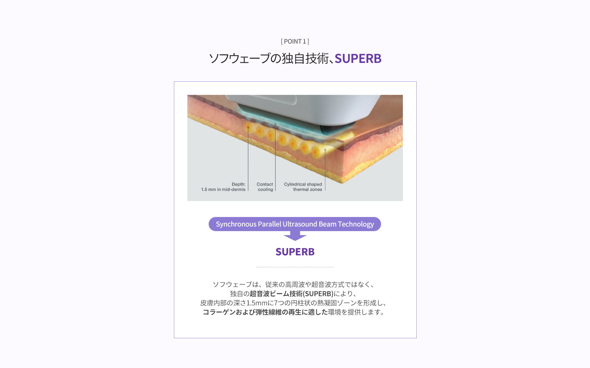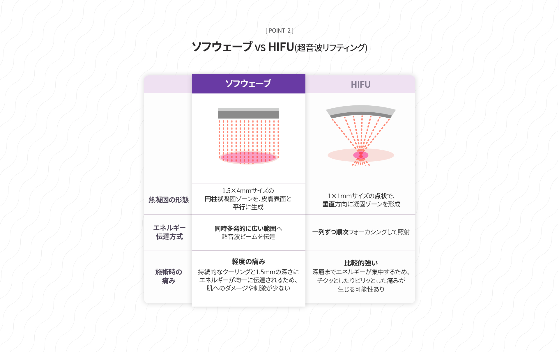 ソフウェーブは、高強度超音波エネルギーによって皮膚内部のコラーゲン再生を促し、弾力改善とリフティング効果をサポートする施術です。